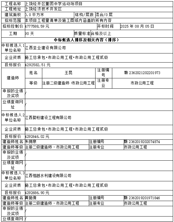 一、項(xiàng)目概況本招標(biāo)項(xiàng)目上饒經(jīng)開(kāi)區(qū)新科大道西側(cè)工業(yè)項(xiàng)目土地平整工程已由饒開(kāi)經(jīng)發(fā)[2025]51號(hào)文件批準(zhǔn)建設(shè),招標(biāo)人為上饒筆架山投資發(fā)展有限公司,建設(shè)資金已落實(shí),項(xiàng)目已具備招標(biāo)條件,現(xiàn)進(jìn)行公開(kāi)搖選,選定一家施工單位,現(xiàn)將有關(guān)事項(xiàng)公告如下:二、項(xiàng)目基本情況:1、項(xiàng)目名稱:上饒經(jīng)開(kāi)區(qū)新科大道西側(cè)工業(yè)項(xiàng)目土地平整工程... [更多]