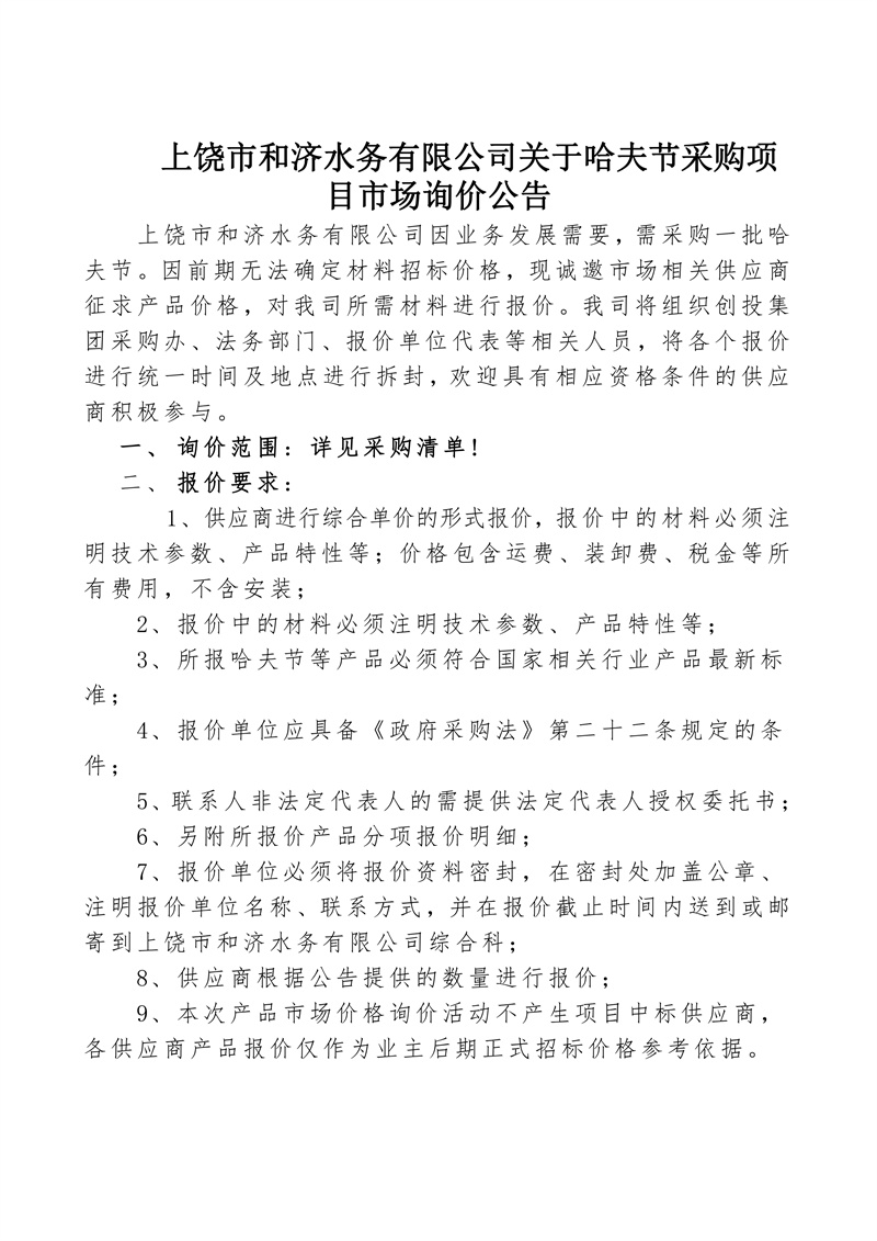 上饒市和濟(jì)水務(wù)有限公司關(guān)于哈夫節(jié)采購(gòu)項(xiàng)目市場(chǎng)詢價(jià)公告